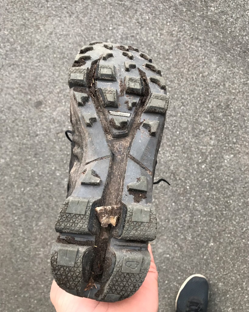 Rødder, sten og mudder, føles som ren skøjtebane og ved kilen i hælen som deler de to “clous” samler der sig mudder og sten og det er der ikke ligefrem nogen fordel ved. Har været virkelig glad for forgængeren til denne model og derfor tror jeg også, at jeg måske er lidt ekstra skuffet.